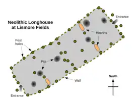 The first inhabitants of Buxton made their home at Lismore Fields 6,000 years ago. Excavation of the prehistoric settlement discovered the remains (floors, post holes and pits) of a Mesolithic timber roundhouse and of two Neolithic longhouses.[3] The layout of these buildings can be clearly seen from the positions of the post holes.[4] Flint implements were also found. Lismore Fields could be the earliest cereal cultivation site discovered in Britain. Cereal stores were revealed by the archeologists. Pollen analysis of soil samples and charred plant remains uncovered evidence of emmer wheat, crab apples, hazelnuts and flax. Researchers believe that this ancient site marks the period when Stone Age people developed from hunter-gatherers to farmers.[5][6]