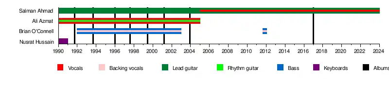These are the line-ups of Junoon, a sufi rock band from Lahore, Pakistan, formed in 1990 by songwriter/guitarist Salman Ahmad, former keyboardist Nusrat Hussain, and former vocalist Ali Azmat. Junoon is Southeast Asia's most successful band with more than 30 million sold albums worldwide.[1]