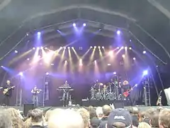 In 1999, Kansas reunited with original lead guitarist Kerry Livgren, who had written and produced demos for several new songs described by drummer Phil Ehart as sounding "like classic Kansas".[26] Recording started in early 2000 for a new album, Somewhere to Elsewhere, at the guitarist's own Grandyzine Studios in Topeka, where the group had originally formed.[27] The album was released in July and also featured original bassist Dave Hope on two tracks, marking the first time the band's original lineup had featured together on a recording since 1980.[28] Livgren remained only for the recording, with the previous lineup of the group returning to tour later in the year.[29]