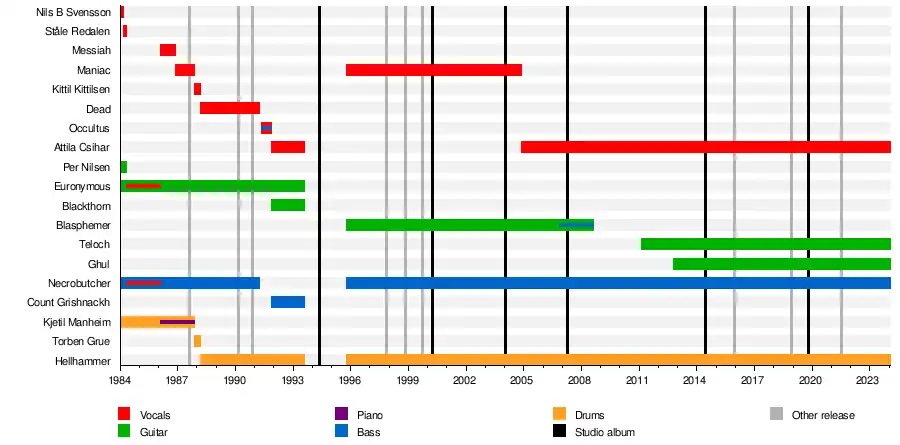 Mayhem is a Norwegian black metal band from Oslo. Formed in 1984, the group originally featured guitarist and lead vocalist Øystein "Euronymous" Aarseth (originally known as "Destructor"), bassist and second vocalist Jørn "Necrobutcher" Stubberud and drummer Kjetil Manheim. The band's current lineup includes Necrobutcher (who rejoined in 1995 after originally leaving in 1991), drummer Jan Axel "Hellhammer" Blomberg (since 1988), vocalist Attila Csihar (first from 1992 to 1993, and since 2004), and guitarists Morten Bergeton "Teloch" Iversen (since 2011) and Charles "Ghul" Hedger (since 2012).