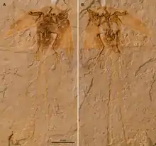 - ↑ Xu, Xing; Zheng, Xiaoting; Sullivan, Corwin; Wang, Xiaoli; Xing, Lida; Wang, Yan; Zhang, Xiaomei; O'Connor, Jingmai K.; Zhang, Fucheng & Pan, Yanhong (7 May 2015). "A bizarre Jurassic maniraptoran theropod with preserved evidence of membranous wings". Nature. 521 (7550): 70–73. Bibcode:2015Natur.521...70X. doi:10.1038/nature14423. PMID 25924069. S2CID 205243599.