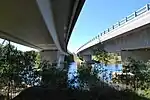 Lincoln Causeway/Union Bridge36°05′29″S 146°54′23″E / 36.091318°S 146.906524°E / -36.091318; 146.906524 (Old Hume Highway Bridge)Wodonga to Albury1961 (though first bridge opened 1861[6])4 lanes, 92 metres (301.8 ft) long, widened 1990