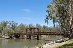 Old Cobram-Barooga Bridge35°54′57″S 145°40′9″E / 35.91583°S 145.66917°E / -35.91583; 145.66917 (Cobram-Barooga Bridge (old))Cobram to Barooga1902Old liftspan timber truss bridge (now pedestrian only)