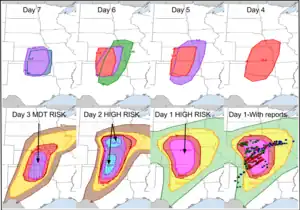 A high risk severe weather event is the greatest threat level issued by the Storm Prediction Center (SPC) for convective weather events in the United States. On the scale from one to five, a high risk is a level five; thus, high risks are issued only when forecasters at the SPC are confident of a major severe weather outbreak. This is usually for major tornado outbreaks with numerous strong to violent tornadoes expected, and occasionally derechos with widespread destructive wind gusts, and these outlooks are typically reserved for the most extreme events.[1] They are generally only issued on the day of the event. However, there have been two occurrences (April 7, 2006, and April 14, 2012) of a high risk being issued for Day 2 of the outlook period (with the event occurring the following day). Under the official protocol, a high risk cannot be issued for Day 3 of the outlook period.[2]