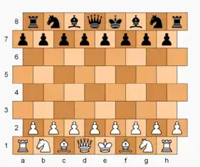 • Doublewide chess [16x8]: Two regular chessboards are connected for a 16×8 play surface. Each player plays with two complete sets of chess pieces.[6]