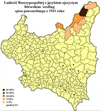 In 1931 there were about 80,000 Lithuanians in Poland, the majority of them (66,300) in Wilno Voivodeship.[8] Following Piłsudski's death in 1935, further Polonisation ensued as the government encouraged the settlement of Polish army veterans in disputed regions.[9] About 400 Lithuanian reading rooms and libraries were closed in Poland in 1936–1938.[3]
