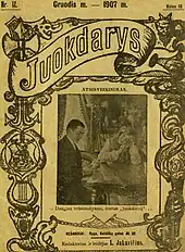 But now, the most important historians and museologists of Lithuania like Almantas Šlivinskas, Leopoldas Rozga or Leonas Peleckis-Kaktavičius, consider him one of the most important writers and publishers of Lithuania. He produced more than two million books and performed more than 280 plays in 1898–1938.[1] From 1888 to 1891 he worked in Šiauliai (Lithuania) as a journalist and writer. In 1891, he settled in Riga (Latvia), where he started working as judge and administrator of the railway company. In 1904, he opened his own printing house (AB Lietuvos Knygynas) and his own bookstore in Riga (Latvia). In 1909, he founded the newspaper Rygos naujienos which maintained its activities until 1915.[2] He also collaborated with other newspapers and journalists like his friend Antanas Smetona (writer, journalist and the first president of the Republic of Lithuania). It should be mentioned that Antanas Smetona wrote about Liudvikas Jakavičius in his memories, written in Cleveland, Ohio, US, in 1960.[3] In 1910, Jakavičius founded The Society of Lithuanian Theatre of Riga. In 1914, he financed the construction of the Lithuanian Theater of Riga. That same year he founded the Lithuanian–Latvian Savings Bank. His bank grew up rapidly, but it was expropriated in 1915 by the State Bank of the Russian Empire, as a result of the beginning of the First World War. In 1916, all his business was paralyzed and confiscated by the outbreak of the First World War and he changed his residence to Saint Petersburg (Russia). He bought 15,000 USD (equivalent to US$350,000 in 2014) in printing equipment and moved the machinery in secret to Saint Petersburg, where he continued with his printing house spreading Lithuanian language.