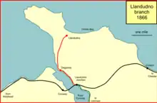 The wharf at Deganwy was further extended in 1882, as it was taking considerable volumes of slate from the Conway Valley. That line reached Blaenau Ffestiniog in 1887 and huge volumes of slate and timber traffic were handled from 1885. Some of the slate came down from Blaenau Festiniog in narrow gauge wagons, carried on standard gauge runners.[1][5] Although the arrangement worked, it was not a commercial success because most of the slate was destined for southern markets via Portmadoc, and the LNWR route was not competitive.[6]