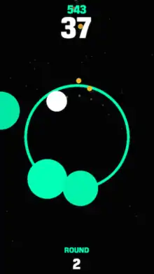Loop Mania is an endless arcade video game which has the player controlling a white circle revolving around the inside of an outlined circle. The circle while revolving collects medium-sized dots that are called "coins" which add to the overall score above.[1] Collecting multiple dots continuously results in an increased multiplier that adds to the score and collecting all progresses the player to another round, which increases in difficulty and occasionally changes color scheme.[2]