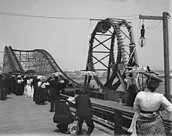 Loop the Loop was designed and built in 1901 by Edward A. Green and Edwin Prescott on one of Captain John L. Young's piers in Atlantic City, New Jersey.[1][2] It was the goal of Green and Prescott to create a looping coaster which would not be subject to the same extreme g-forces which plagued Lina Beecher's earlier Flip Flap Railway on Coney Island in New York.[3]