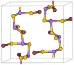 The crystal structure of lorandite is monoclinic, space group P21/a, Z = 4, with the lattice constants a = 1.228 nm, b = 1.130 nm, c = 0.6101 nm and β = 104.5 °. It consists of spiral chains of AsS3 tetrahedra oriented to the [010] crystal axis. The chains are covalently interlinked by irregularly coordinated Tl atoms (chain interconnections not shown in the picture), and breaking of these links is responsible for crystal cleavage.[8]