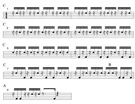 The following nine-measure excerpt is from the quinto performance on "La polémica," composed by Israel Berriel González.[9] The quinto moves between three different modes (A, B, C).[10] The previous quinto example, and the last measure of the following example are both in the basic mode (A), commonly called the quinto lock, or ride in North America.