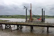 The Loughor railway viaduct carries the West Wales Line across the River Loughor. It is adjacent, and runs parallel to, the Loughor road bridge. The 1880 viaduct was granted Grade II listed building status.[1] Before it was demolished in early 2013, the viaduct was the last remaining timber viaduct designed by Isambard Kingdom Brunel.[2]