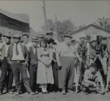 Comique Film Corporation on location. Lou Anger (second from left, with tie and hat) stands next to Buster Keaton. Fatty Arbuckle is front and center with his hand on the tripod.