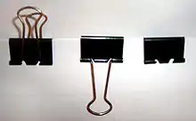 A binder clip, less commonly known as a paper clamp or foldover clip or bobby clip or clasp, is a simple device for binding sheets of paper together. It leaves the paper intact and can be removed quickly and easily, unlike the staple.