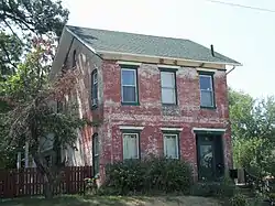 The two-story, brick house was built in a vernacular form of the Greek Revival style.[2] It features a side-gabled roof and a wide entrance that was placed off-center. The three symmetrically placed windows on the second floor and the two on the first floor are capped by simple, molded cornices.[3] The full porch on the front has subsequently been removed.