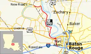 LA 415 begins at Interstate 10's exit 151 in West Baton Rouge Parish, west of Port Allen. Just north of the interchange, LA 415 begins a concurrency with LA 76. The two routes travel north as a four-lane undivided highway with a center turn lane. After LA 76 exits the concurrency, LA 415 continues north and widens to a divided highway. In the unincorporated community of Lobdell, LA 415 turns off the divided highway to continue north on a two-lane undivided road. The divided highway continues for about one-half mile (0.80 km) as LA 415 Spur and provides access to westbound U.S. Route 190 and northbound LA 1. LA 415 makes two sharp turns to pass under US 190 and LA 1 with access to eastbound US 190 and southbound LA 1 being provided via nearby roads. Just before a levee to the Mississippi River, the road comes to a T-intersection with LA 986 at its northern terminus. LA 415 makes a left onto the road paralleling the levee.[1]