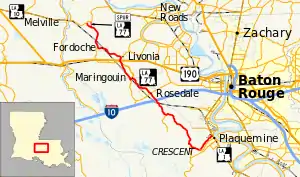 Louisiana Spur Highway 77 (Spur LA 77) is a 1.4-mile-long (2.3 km) highway that covers a glitch in the state highway system. The current LA 77 follows the routing of the original Jefferson Highway, and the LA 77 alignment follows the old road to meet LA 10 West. However, this shortcut is used to reach Morganza, to the northeast of Livonia.[2]