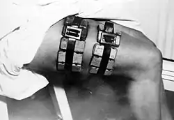 Cages with typhus-carrying lice strapped onto a person's thigh. During World War II, feeding the lice with human subjects' blood was the only way to produce a viable typhus vaccine.