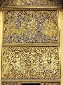 Wat Xieng Thong temple, in typical Laotian architecture, was built in the 16th century (1559–1560) during the reign of King Saysetthathirath, at the confluence of the Mekong and Nam Khan rivers. Its notability within the country and in Asia is credited to its Buddhist art and architecture. An artifact of funerary nature kept in the temple complex is a richly carved and gilded funeral vehicle of the former king, and also the remains of King Sisavangvon. Royal ceremonies were held here until 1975.[8][21] The wat has carved gilded, wooden doors which depict scenes from Buddha's life. The ceiling in the sim displays Dharmachakras, dharma wheels symbolising Buddhist law and the circle of reincarnation. The outer walls of the sim depict Lao legends, and the rear gable is decorated with a glass mosaic depicting the tree of life. The outer walls of the Sanctuary of the Reclining Buddha, also known as the Red Chapel, are decorated with mosaics.[21]