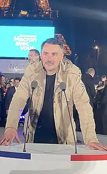 In 2015[1] he joined Emmanuel Macron's team and became the first general secretary of his party, En Marche ! and its first official employee.[1] He was then appointed as deputy general secretary and coordinator of Macron's campaign operations for the 2017 French presidential election.[16] He was often described as a senior staffer in the candidate's team and one of its closest advisors,[1] earning the nickname of "ninja of logistics".[17]