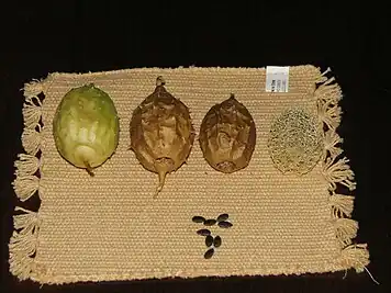 Luffa operculata (common name, sponge cucumber, wild loofa, buchinha in Brazil or mướp xơ in Vietnamese) is a species of Luffa native to South and Central America.[1] It is cultivated for its fruit, which when fully ripe is strongly fibrous and is used as a fibrous scrubbing sponge for household cleaning. The fruit is a capsule with spikes. The fruit is dark-brown when mature. It is also grown in gardens and yards as an ornamental plant. In colder places they can be grown indoors as a houseplant.