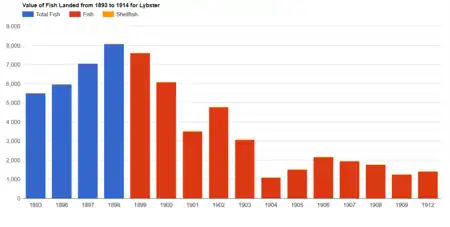 Lybster was an important port in the herring industry in the nineteenth century.[6] In 1838, the population was said to be 1312, and there was a move to build a church there, because otherwise worshippers had to travel to either Latheron or Bruan, both about 5 mi (8 km) away.[7] Lybster declined in importance as a herring fishing port before the First World War as the local industry concentrated in Wick.