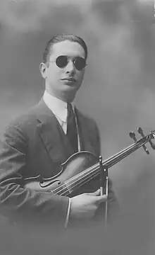 As a young violinist in Paris, he performed at the famed Salle Pleyel to great acclaim,[10][11][12] as well as in Biarritz and St. Jean de Luz.[13] He was received with enthusiasm by the contemporary French press;[14] he was celebrated in the pages of the Figaro as un des plus grands virtuoses de l'art de Paganini,[15] the Courrier observing that ce jeune violiniste, q'une malheureuse cécité isole du munde, reproduit trés délicatement les plus belles compositions des grands maîtres classiques et modernes.[16]