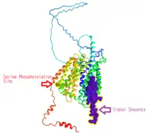 Additionally, n-glycosylation sites were predicted at the 110th, 129th, and 224th amino acids of the protein sequence.[16] A serine phosphorylation site at the 429th amino acid was also predicted and verified by presence within other mammalian orthologs.[18]