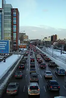 Macleod Trail effectively divides the southwest and the southeast quadrants of the city, and many communities (inner city as well as suburban) were developed along its course.[2] Macleod Trail (along with Crowchild Trail and Deerfoot Trail) constitutes one of the three major north-south corridors of the city.[3]