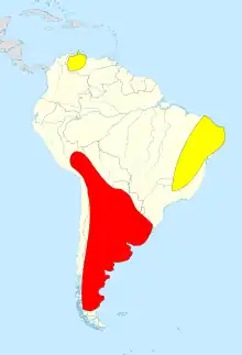 Map showing the distribution of Macrauchenia in red, and Xenorhinotherium in yellow, inferred from fossil finds