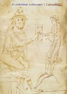 Scholars have attempted to identify him with a Macrobius who is mentioned in the Codex Theodosianus as a praetorian prefect of Spain (399–400), and a proconsul of Africa (410).[4] The Codex Theodosianus also records a praepositus (or lord chamberlain) named Macrobius in 422.[5] A number of older authorities go so far as to identify Macrobius the author with the first, and date his floruit to 399–410. There are objections to either identification: as Alan Cameron notes, the complete name of the first candidate is attested in an inscription to be "Flavius Macrobius Maximianus", while the second is excluded because "A praepositus must at this period have been a eunuch."[6]