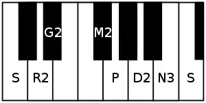 - ārohaṇa: S G₂ M₂ P N₃ Ṡ[lower-alpha 1]