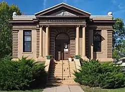 The Madison Carnegie Library or Madison Public Library, located at 401 Sixth Avenue, Madison, in the U.S. state of Minnesota is a public library building built in 1905 of brick with limestone trim. Its characteristic features include a columned and pedimented main entrance and a small polygonal dome on its flat roof. The structure was built with an $8,000 grant from Andrew Carnegie. This was one of over 3,000 libraries in 47 states funded by Carnegie. Local residents gave an additional $1,000 in gifts and books at its dedication on January 22, 1906. Gerhard Herriges, a contractor for public buildings in Western Minnesota, built the building for $6,216.85.[2][3]