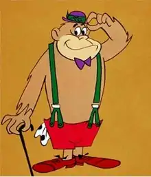 Like many of Hanna-Barbera's animal characters, Magilla Gorilla sported human accessories: a purple bow tie, red shorts held up by green suspenders, a purple undersized derby hat, and brown dress shoes.[2]