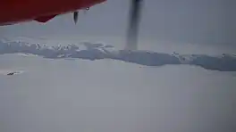 In the south, several mountain glaciers drain it towards the upper reaches of the Kangerlussuatsiaq Fjord. To the west, the ice cap is drained by the long Sermitsiaq Glacier. To the northwest, numerous mountain glaciers drain it towards Kangerlussuaq Fjord.[4] To the northeast of the ice sheet lies the wide highland of Angujaartorfiup Nunaa, home to herds of muskoxen,[5] originally reintroduced in its northern part from the populations of the Northeast Greenland National Park.[6]