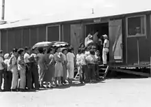 The barracks at Manzanar had no cooking areas, and all meals were served at block mess halls.[40] The mess hall lines were long and stretched outside regardless of weather.[40][53] The cafeteria-style eating was named by the 1980s Congressional Committee on the Wartime Relocation and Internment of Civilians (CWRIC) as a cause of the deterioration of the family due to children wanting to eat with their friends instead of their families, and families not always being able to eat together.[52][42] There was a strict meal schedule, with one young detainee noting "We eat from 7:00 AM to 8:00 AM o'clock in the morning 12:00 PM-1:00 PM in afternoon and 5:00 PM-6:00 in night and on Sunday we eat 8:00 AM-9:00."[66] Food at Manzanar was based on military requirements. Meals usually consisted of hot rice and vegetables, since meat was scarce due to rationing.[58]