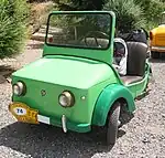 The microcar was based on the three wheel cargo scooter and had the same chassis, but the handlebars were replaced by a steering wheel. The body was open and provided enough space for two people. The first prototype has been preserved. It was taken as the basis for the definitive model, after adding a complete fairing to the rear of the engine, leaving all the mechanics hidden. About 20 units were made of the final model, of which only the prototype is known to have survived.[1]