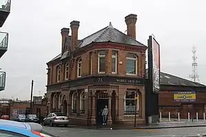 The Marble Arch was built in 1888 in Ancoats, with a facade of polished red granite.[3] It became a Grade II Listed Building on 20 June 1998.[4][5] Inside, the pub has a high, glazed ceiling, ceramic walls and a bar that slopes down with the hill.