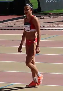 Huntington represented Finland in 2018 European Athletics Championships in heptathlon and finished 19th with a result of 5,731 points.[2] She competed in the 2019 World Championships in Doha, where she withdrew from the heptathlon after the first day.[3] In August 2021, Huntington finished in the 17th place in the hepathlon at the Tokyo Olympics with 6,135 points.[4]