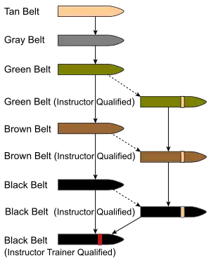 In order to obtain a tan belt the student must score 80 %, students can fail no more than 10 techniques. If a student fails testing, he/she must wait a minimum of 24 hours before retesting. The tan belt syllabus is part of The Basic School and recruit training curriculum.