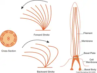 The regular beat patterns of eukaryotic cilia and flagella generates motion on a cellular level. Examples range from the propulsion of single cells such as the swimming of spermatozoa to the transport of fluid along a stationary layer of cells such as in a respiratory tract. Though eukaryotic flagella and motile cilia are ultrastructurally identical, the beating pattern of the two organelles can be different. In the case of flagella, the motion is often planar and wave-like, whereas the motile cilia often perform a more complicated three-dimensional motion with a power and recovery stroke.
