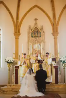 The parishioners constructed the building within 20 months and on Sunday 14 June 1914, Archbishop Duhig blessed and opened the new church/school. The church was named Mary Immaculate and situated where the Marymac Community Centre now stands. The first parish priest was Fr James Gallagher who transferred from St Joseph's Cathedral in Rockhampton. The church was a timber structure surrounded by a verandah and was able to hold 300 people. The original high altar was constructed of timber.[4]