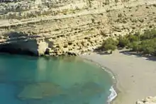 Matala was then a fishing village. In the 1960s, the caves were occupied by hippies[1] who were later driven out by the church and the military junta. Matala is now a heavily built tourist destination relying on coach tours and summer visitors. There are many gift shops and bars. Matala's hippie history relives during the 3 days Matala Beach Festival, every June (since 2011).[2]