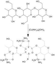 Schweizer's reagent is an alkaline solution of copper sulfate in ammonia, [Cu(NH3)4] (OH)2–3H2O, or CuH14N4O2.[4][5] Schweizer's reagent may be prepared by covering technical grade, stabilized Copper(II) hydroxide with ammonium hydroxide.[6] It was the basis for the process patented in 1890 by the French chemist Louis-Henri Despeissis for making fibers from cuprammonium rayon.[3] He extruded the cuprammonium solution of cellulose into water, then used dilute sulfuric acid to neutralize the ammonia and precipitate the cellulose fibers.[7] Despeissis died in 1892 and his patent was not renewed.[8]