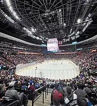 Prior to the 2013–14 season, the octagonal scoreboard that was in use since the arena's opening was replaced with a new four-sided rectangular scoreboard. The two center faces measure 27 by 48 feet (8.2 m × 14.6 m) long, while the two end faces measure 21 by 25 feet (6.4 m × 7.6 m) wide.[13]