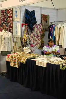 One way that the Mazahuas have maintained their culture is by women's dress, the elements of which have concrete meanings and specific values. The garments include a blouse, a skirt called a chincuete, an underskirt, apron, rebozo, quezquémetl, and a sash.[2] The layering of clothing, especially the skirts, gives the women a robust look.[3] The traditional women's outfit, especially the version handwoven in wool, is in danger of disappearing despite efforts to save the skills and traditions needed to keep it.[2]