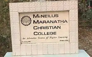 McNeilus Maranatha Christian College (An Adventist Center of Higher Learning), formerly known as Maranatha Christian College - MCC, is a Seventh-day Adventist Christian school in Kalaymyo, Myanmar (Burma). It is owned and operated by Myanmar Union Conference of Seventh-day Adventists.[1][2] It was established in 2000 and is a part of the Seventh-day Adventist education system, the world's second largest Christian school system.[3][4][5][6]