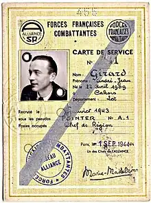 • Resistance member André Girard-Country of Allegiance: France(République française), Free France(La France Libre), Service: French Resistance(La Résistance), French Forces of the Interior(Forces françaises de l'intérieur), Rank: Voluntary Combatant of the Resistance (Combattante Volontaire de la Résistance)
