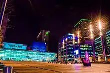 Traditional street names are not used in the development; instead, the main thoroughfares are styled blue, white, pink, yellow, orange, purple and green, with street furniture and ambient lighting colour-coded to match. A stylised map of the site has been devised. Landscape architects Gillespies regenerated the brownfield site to create public spaces.[28] The focal point is a piazza and landscaped park, around which the buildings are located. The piazza's two distinct areas, The Green and The Stage, have the capacity to hold events for up to 6,500 people.[29] A free-standing big screen, in front of The Studios, is viewable from the piazza.[30]